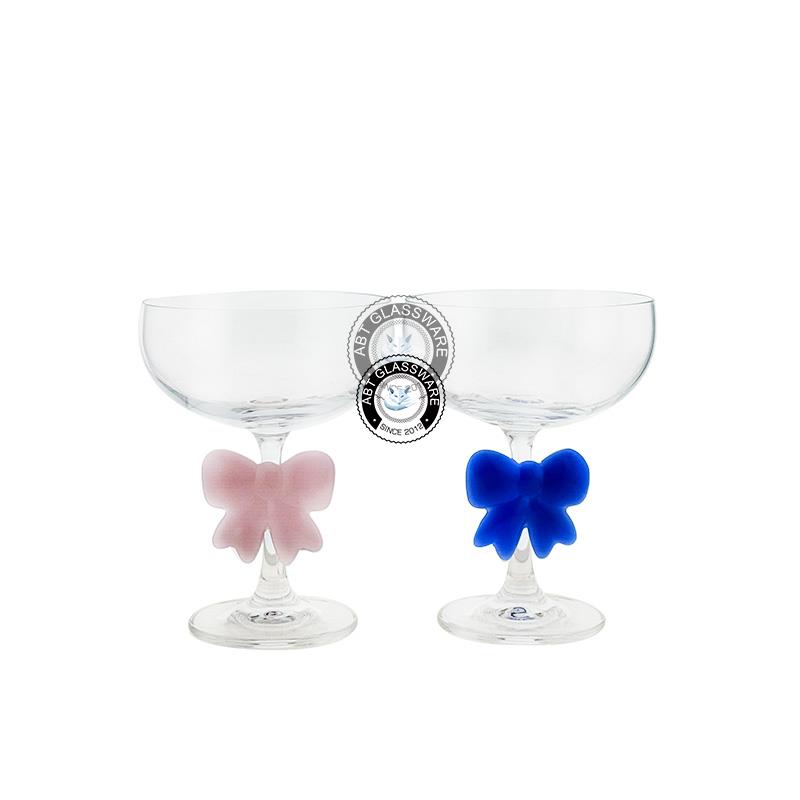 This is a set of coupe glasses. Each glass features a clear, rounded bowl with a slender stem and a stable base. Attached to the stem of one glass is a pink bow, while the other has a blue bow, adding a charming and decorative touch. The overall design combines elegance with a playful, bow - themed aesthetic, making these coupe glasses suitable for serving cocktails or other beverages in a stylish manner.